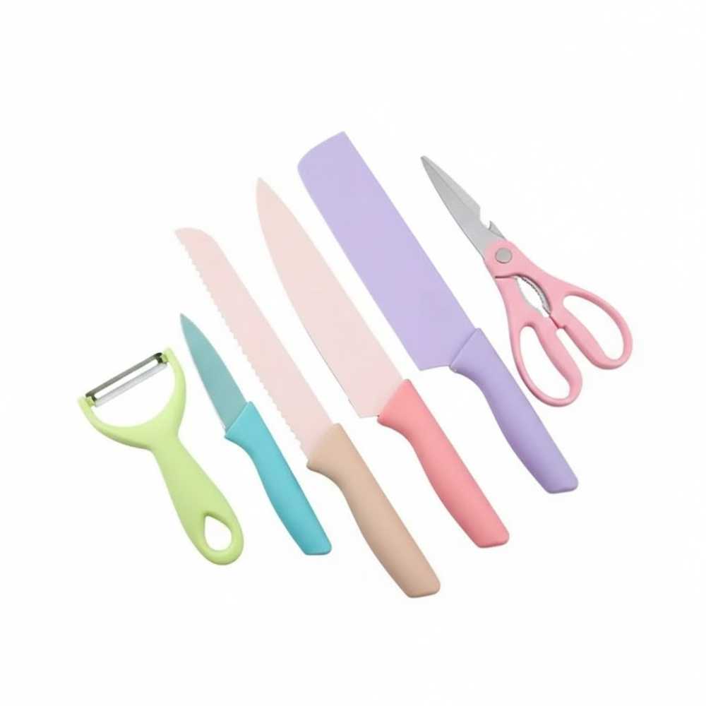 طقم أدوات مطبخ متكامل يضم مجموعة متنوعة من أدوات القطع والتحضير الأساسية، مصمم بأسلوب عصري يجمع بين الكفاءة العملية والمظهر الجمالي الملون