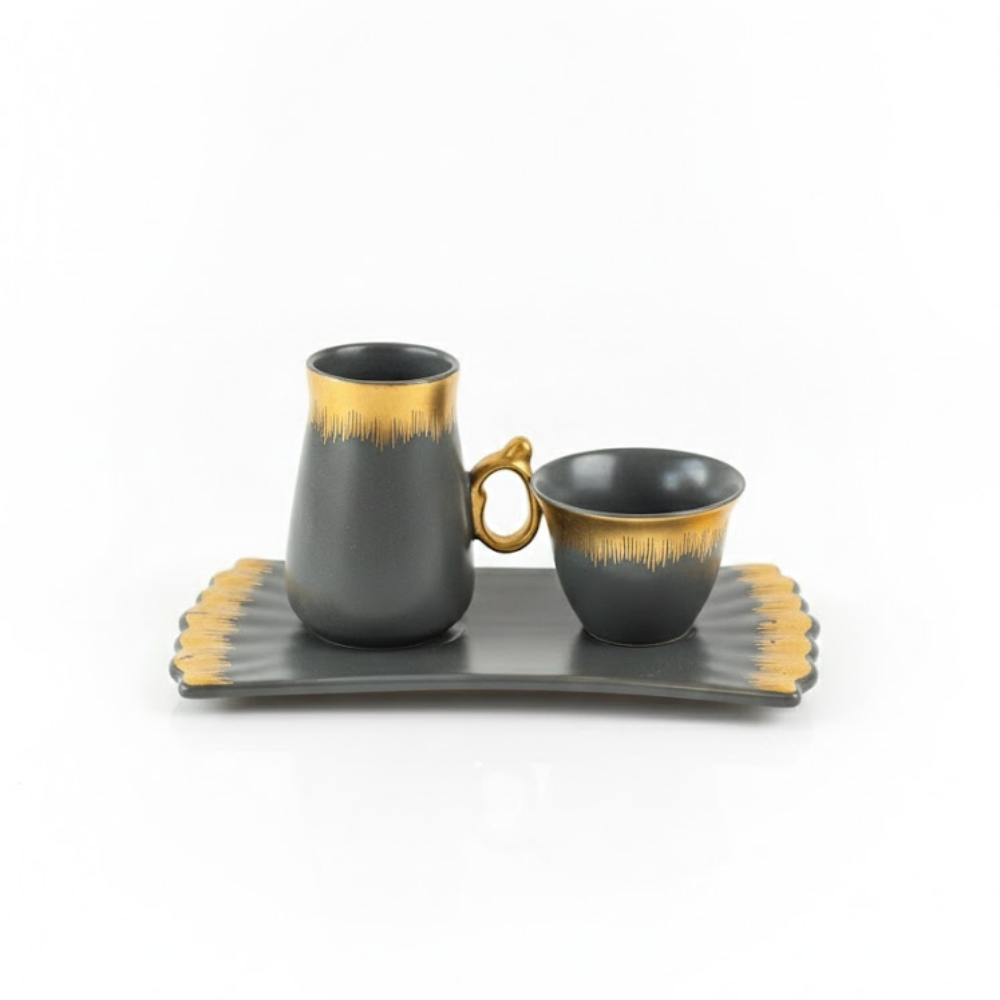 يتميز الطقم بلون رمادي وهو لون محايد وأنيق جداً وتزيين الحواف بطبقة من اللون الذهبي اللامع بأسلوب "ضربات الفرشاة" العشوائية، مما يعطي إيحاءً بأن القطع مشغولة يدوياً وفنية