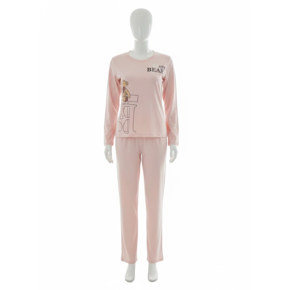 طقم ملابس منزلية نسائي .يتميز بتصميم عملي ومريح بأكمام طويلة وسروال كامل، وهو مخصص للاستخدام اليومي داخل المنزل أو للنوم، ويأتي بلون موحد مع طبعة بسيطة تمنحه طابعاً حيوياً وهادئاً.