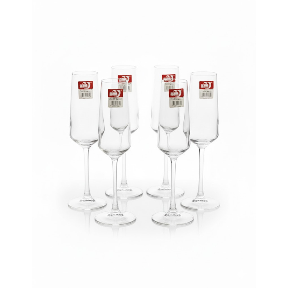 كؤوس زجاجية بتصميم "فلوت" انسيابي، تتميز بسيقان طويلة وقاعدة متزنة تمنحها مظهراً كلاسيكياً فاخرًا. |