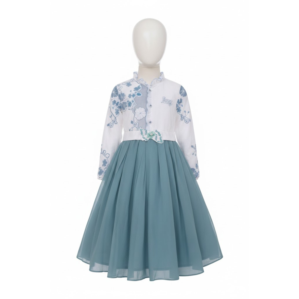 فستان أطفال أنيق يجمع بين صدرية مطرزة بنقوش ورد ناعمة وتنورة واسعة من الشيفون المنسدل