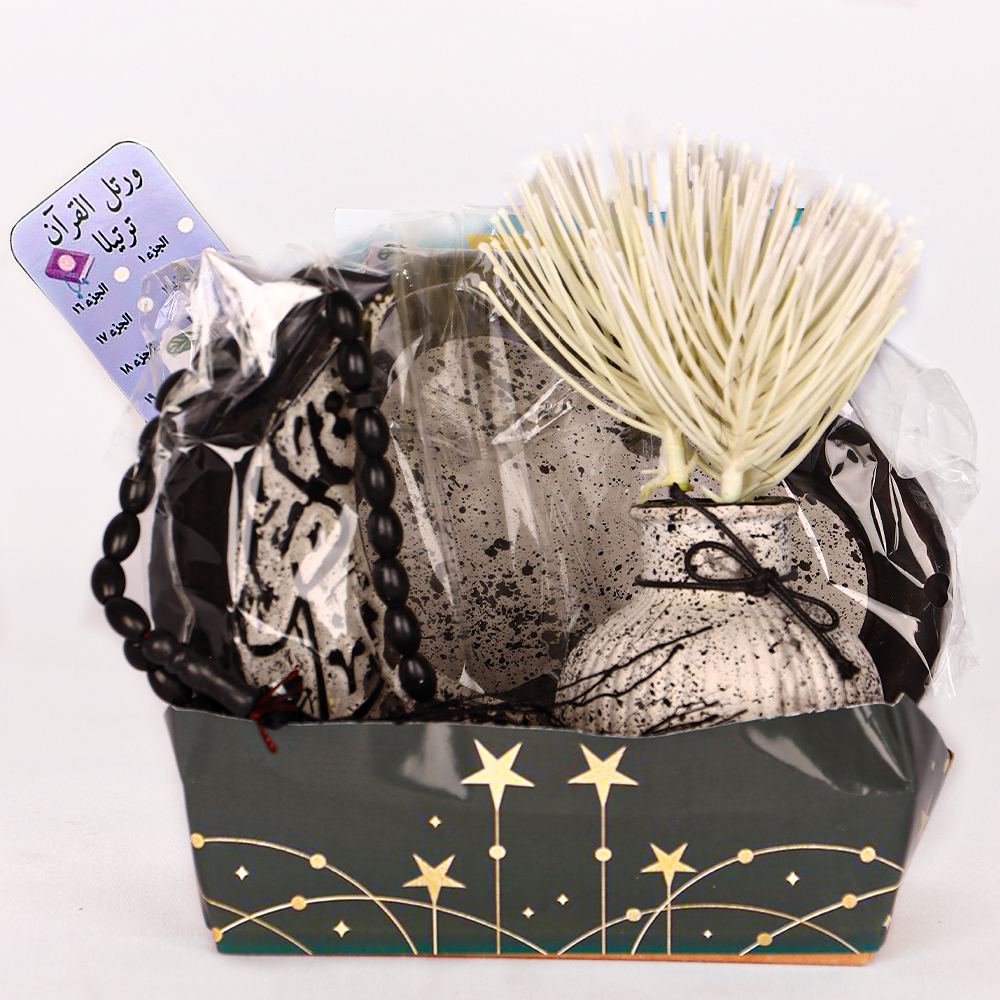 باكج روحاني أنيق يحتوي على مجسم هلال مميز، مزهرية ديكورية، كرت أذكار الصباح والمساء، فواصل مصحف أنيقة، وصينية بتصميم متناسق تجمع بين الجمال والروحانية
