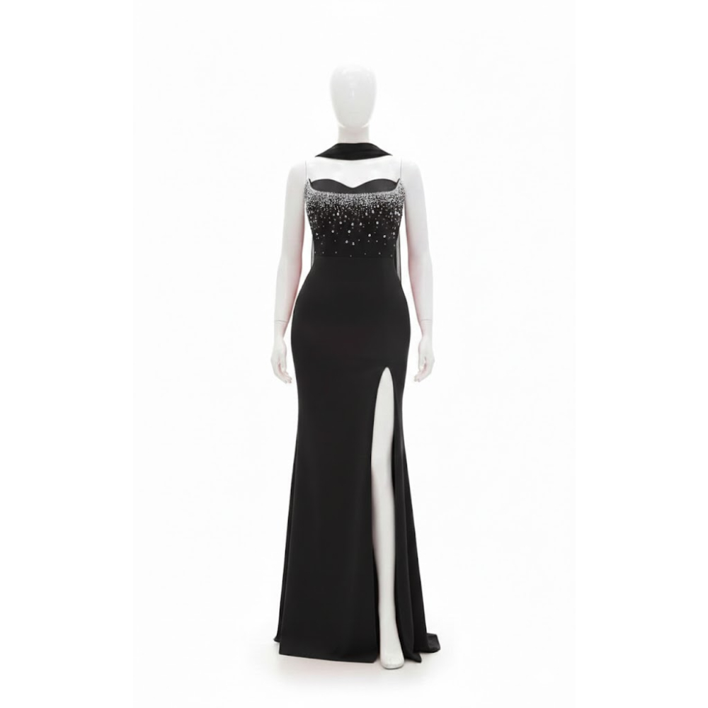 فستان بتصميم راقي وعصري يجمع بين البساطة والفخامة، حيث يعتمد على قصة ضيقة تبرز جمال القوام مع لمسات جمالية في الجزء العلوي تضفي عليه بريقاً خاصاً.