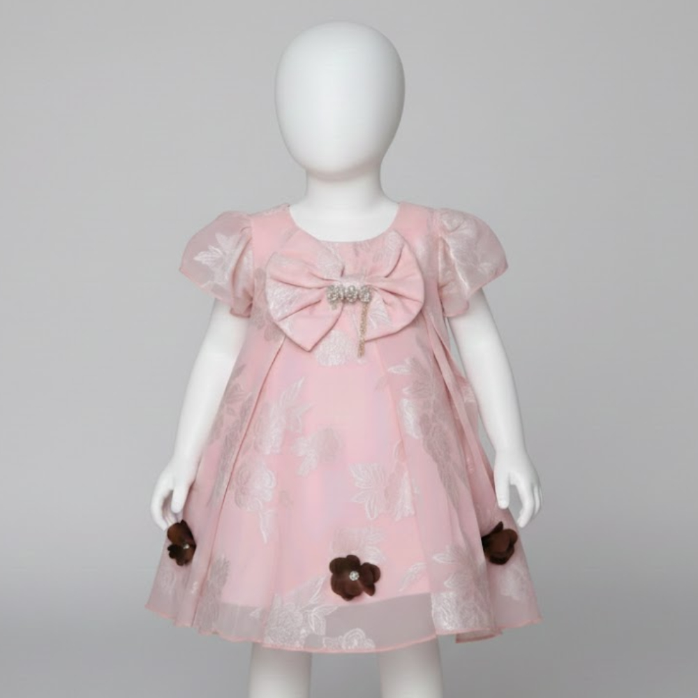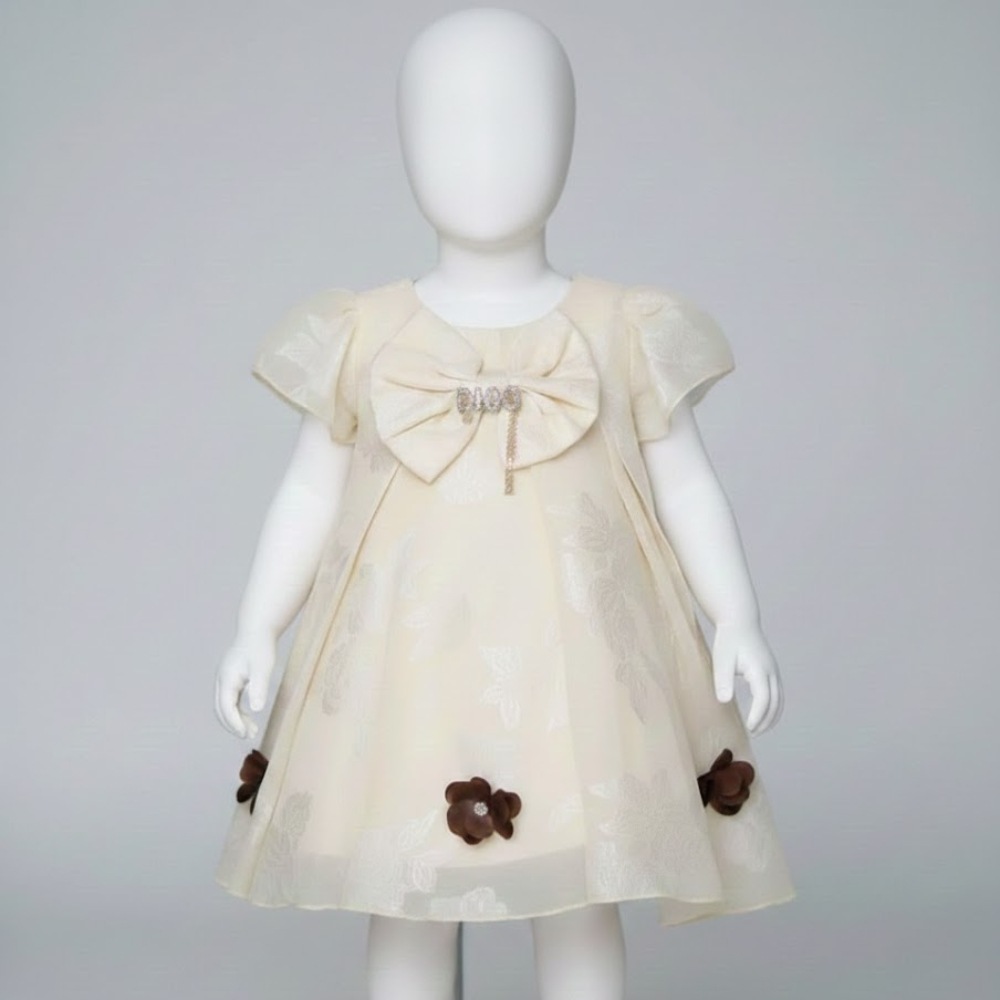 يتميز بأكمام قصيرة ومنفوخة قليلاً بنهايات رقيقة وتأتي بقصة واسعة تتكون من عدة طبقات لتعطي حجماً وشكلاً منفوشاً وما يميز الفستان هو وجود زهور بارزة باللون البني الداكن موزعة على أطراف التنورة من الأسفل، مما يكسر رتابة اللون الطاغي ويمنحه لمسة عصرية ومميزة