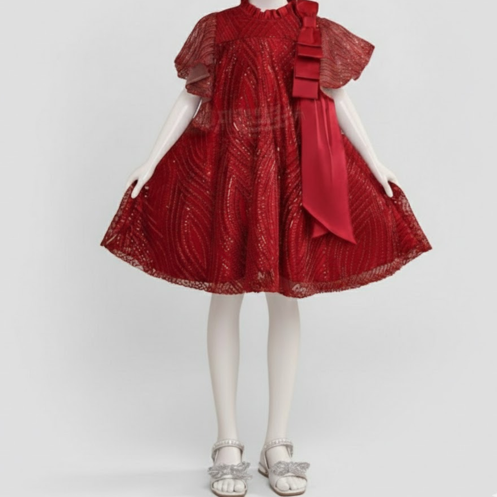 يتميز الفستان بتصميم يجمع بين بريق الترتر الذي يغطي كامل القماش بلمسة فاخرة، وتفاصيل الياقة المزودة بفيونكة ساتان جانبية تضفي لمسة من الأناقة مع أكمام واسعة ومنسدلة تمنح طفلتكِ إطلالة انسيابية مريحة وحضوراً لافتاً في أرقى المناسبات