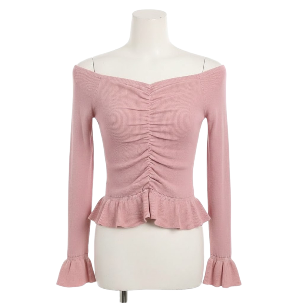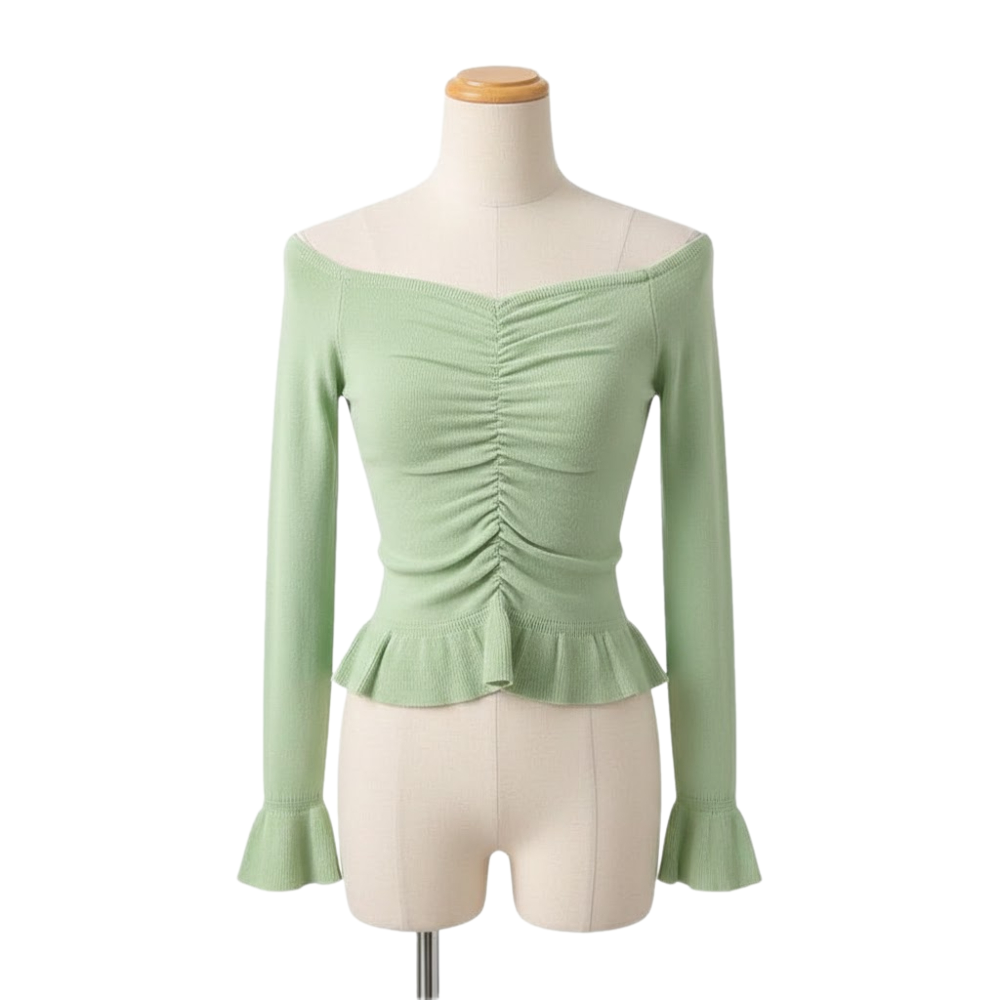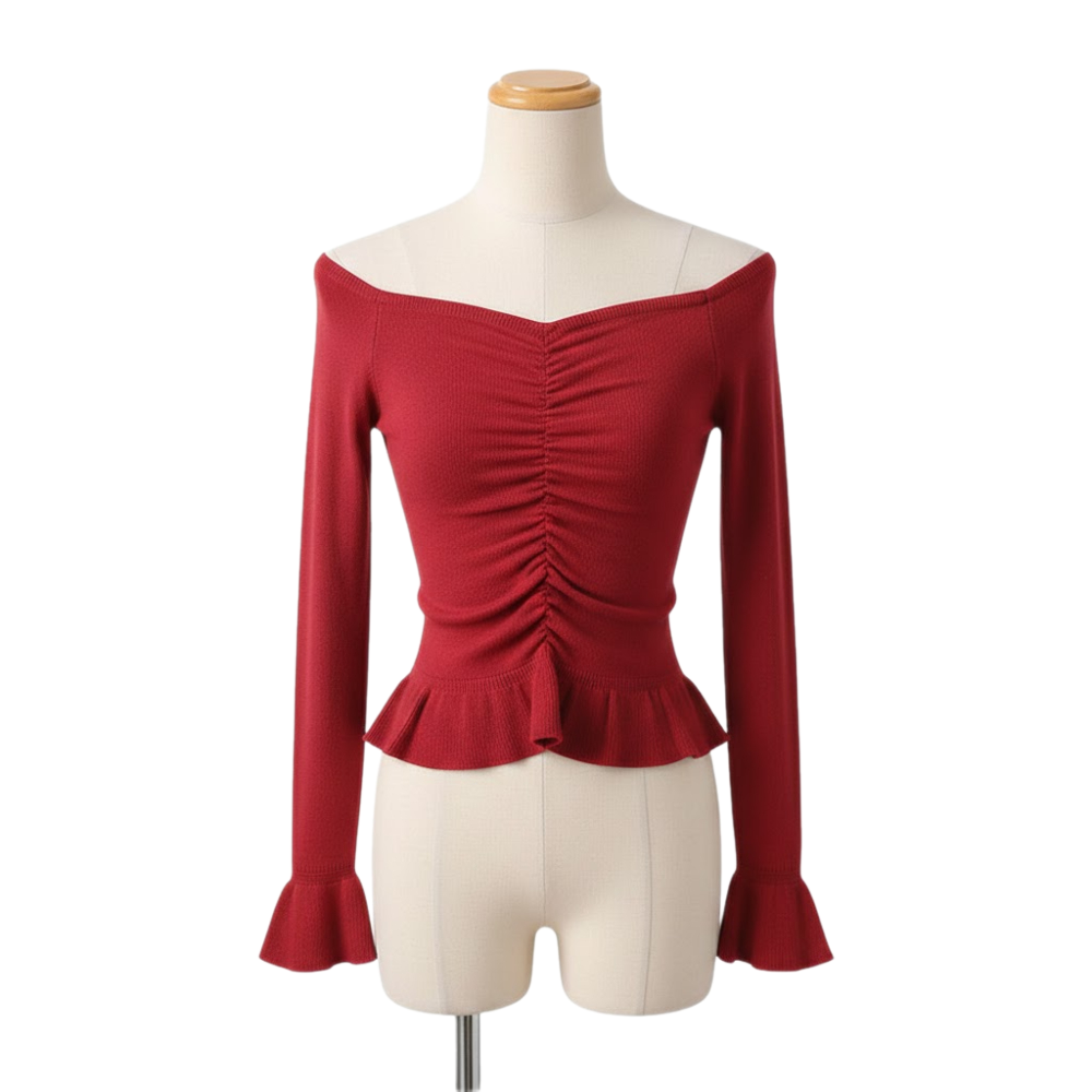 بلوزة أنيقة تجمع بين الرقة والبساطة، مصممة بقصة تبرز جمال القوام مع لمسات جمالية تضفي حيوية على الإطلالة. تتميز بتصميم علوي مكشوف الكتفين وتفاصيل مطوية (زمزم) في المنتصف، مما يمنحها مظهراً متناسقاً وجذاباً.