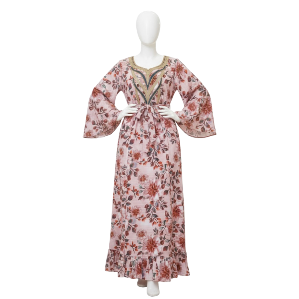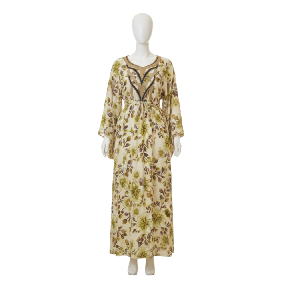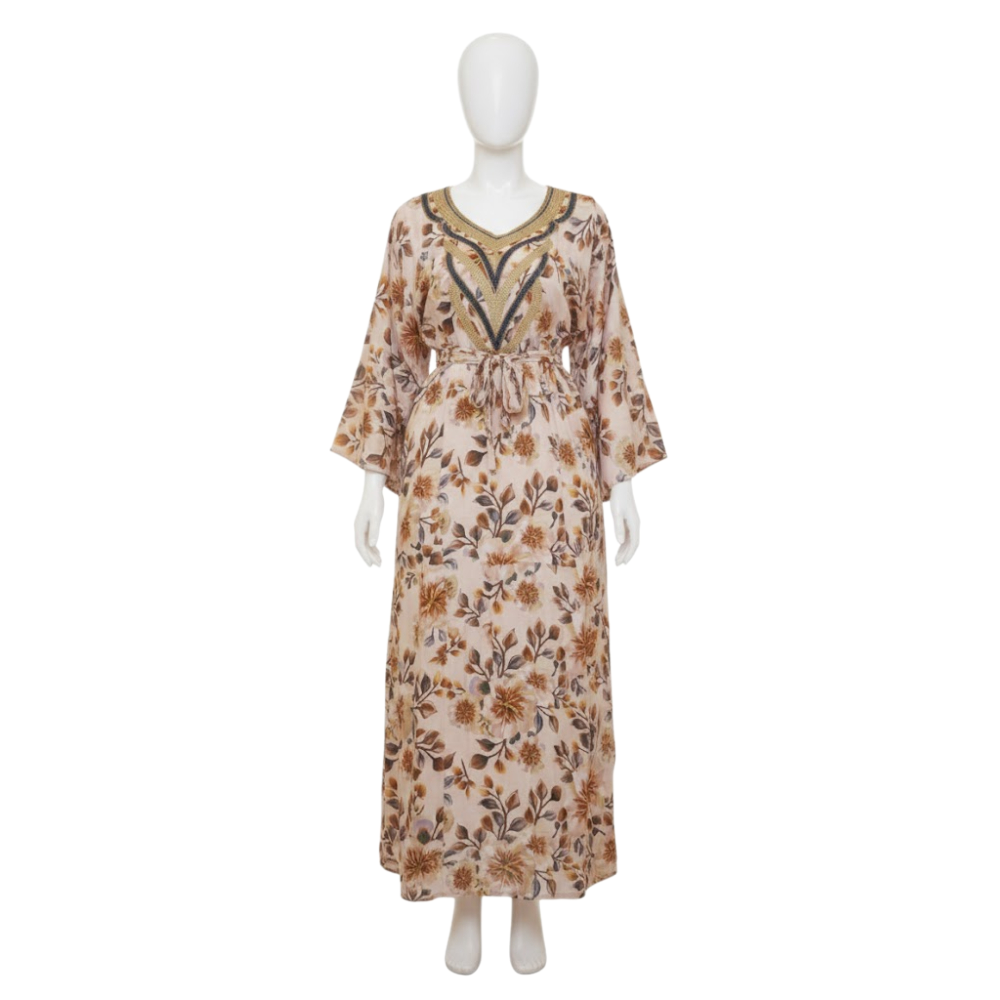 جلابية طويلة تتسم بطابع حيوي بفضل نقوشها المستوحاة من الطبيعة، مع تصميم يجمع بين الأناقة والراحة.