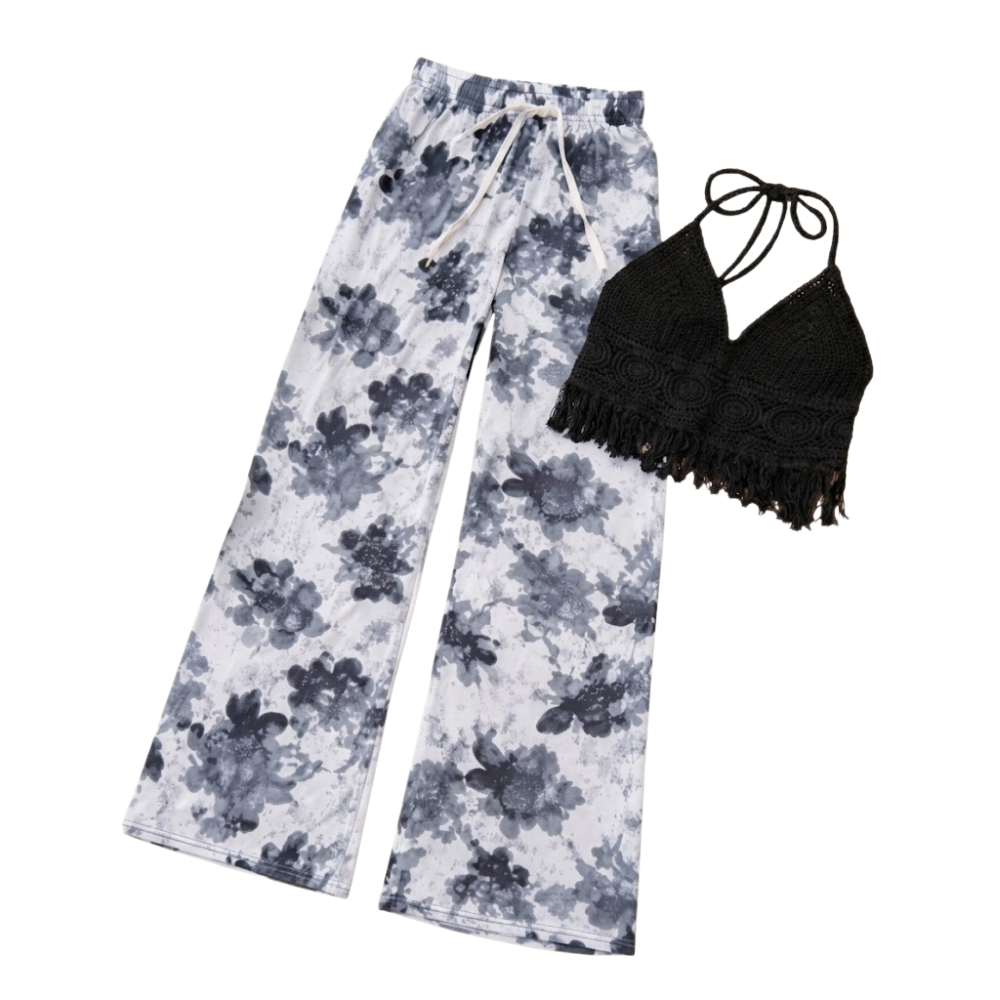 طقم صيفي كاجوال يتكون من توب "كروشيه" قصير بياقة هالتير وبنطال واسع مريح بنقشات مشجرة.