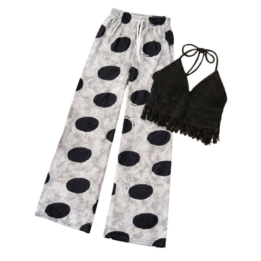 طقم صيفي عصري يجمع بين توب "كروشيه" قصير وبنطال واسع مريح بنقشات "بولكا دوت" الهندسية.