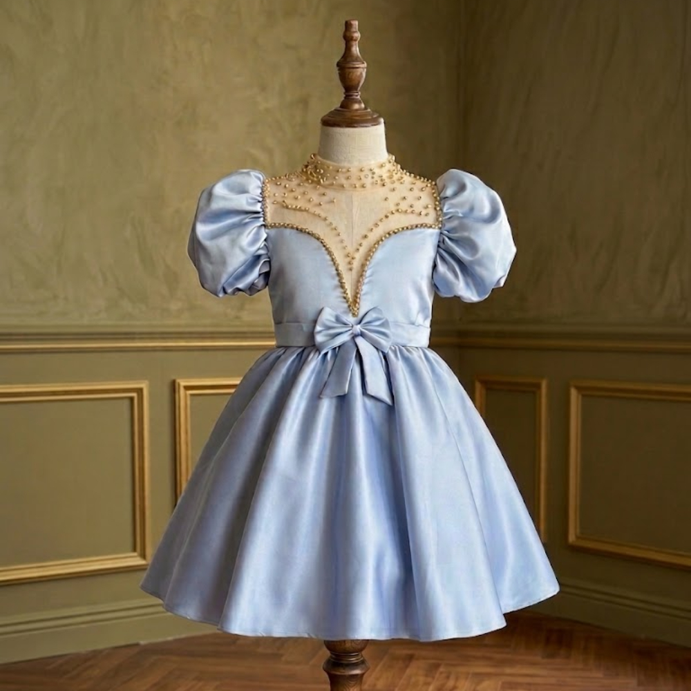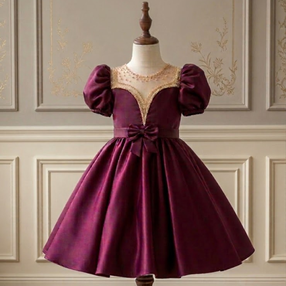يأتي الفستان بقصة واسعة ومنفوشة بكسرات بسيطة، مما يجعلها مناسبة جداً للحفلات والمناسبات الرسمية للأطفال ويزين الخصر حزام من نفس القماش مع فيونكة متوسطة الحجم في المنتصف لتحديد القوام ومنطقة الصدر تتميز بفتحة على شكل حرف V عميقة ويحيط بصفين من الخرز الذهبي، مما يعطي تبايناً جميلاً