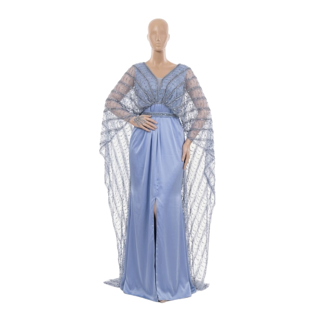 فستان سهرة ملكي يتميز بكاب مطرز ينسدل بنعومة فوق قماش مصقول، مع خصر محدد وفتحة أمامية تمنحكِ إطلالة فاخرة ومبهرة.