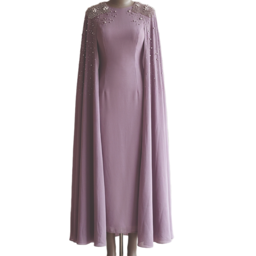 الفستان مصنوع من قماش الكريب الناعم عالي الجودة، والذي يتميز بانسدالية ممتازة لا تلتصق بالجسم، مما يضمن الراحة والحرية في الحركة ويتميز الفستان بقصة الرداء المنسدل من الكتفين، والذي يغني عن استخدام الشال أو الجاكيت