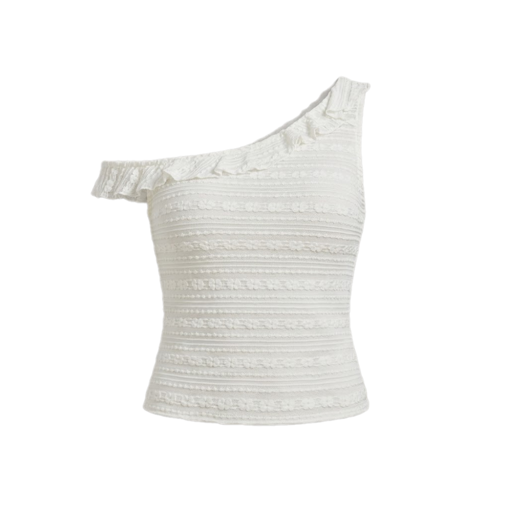 بلوزة عصرية بكتف واحد وتفاصيل كشكشة أنيقة تمنحكِ إطلالة صيفية جذابة وقصة محددة للقوام.
