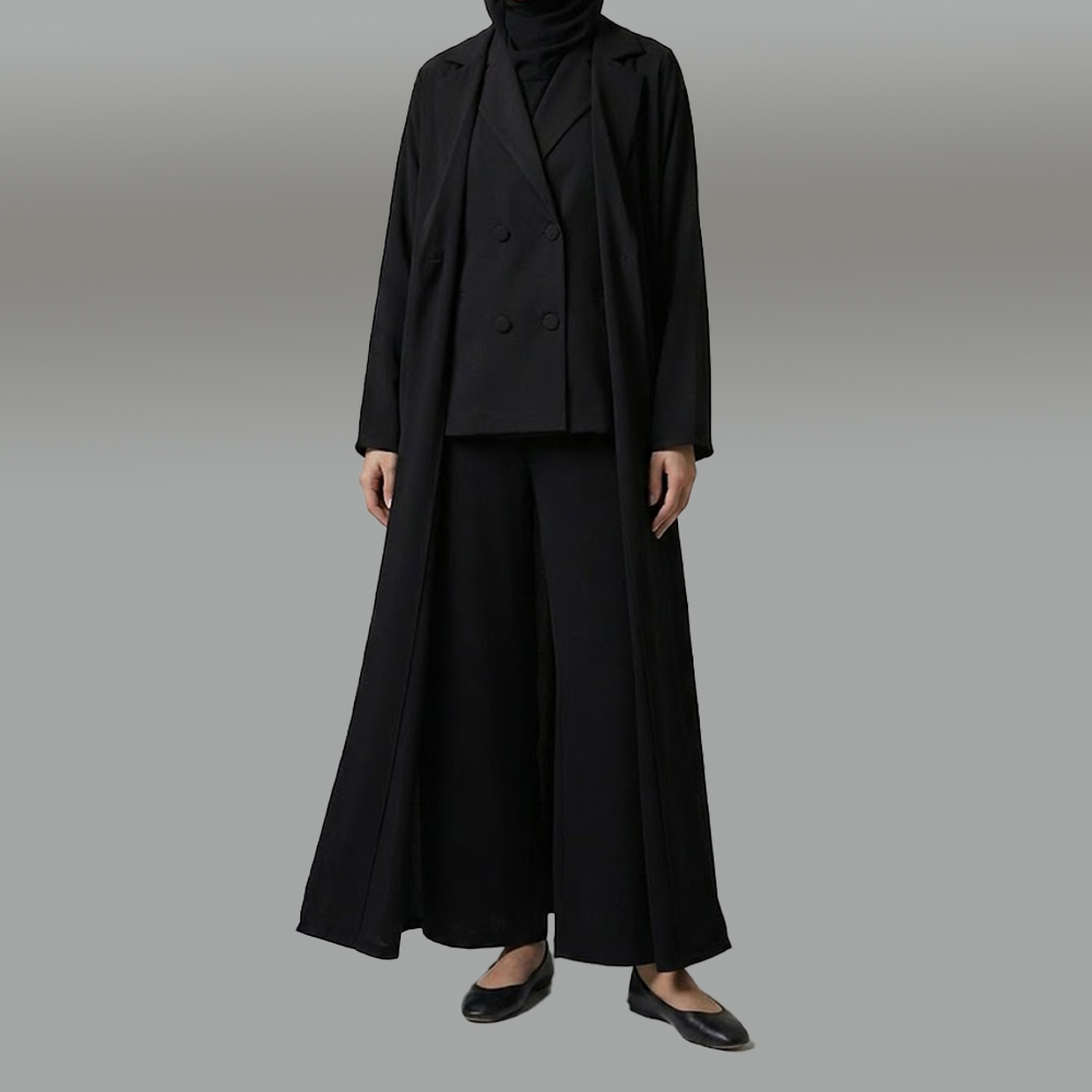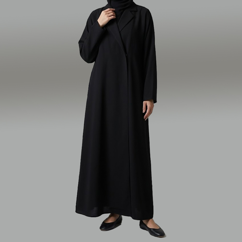 عباية سوداء أنيقة بتصميم مستوحى من القصّات الرسمية، تتميز بياقة كلاسيكية تضيف لمسة عصرية راقية لإطلالة محتشمة ومميزة