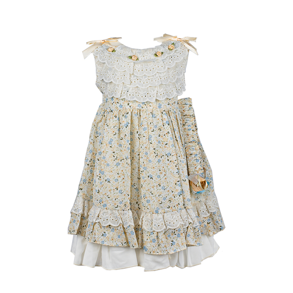 فستان بناتي بنقشة ورود هادئة تزين القماش بالكامل، يتميز بقصة واسعة ومريحة تسمح بالحركة، مع الكشكش الناعم عند الأكمام والحافة السفلية.