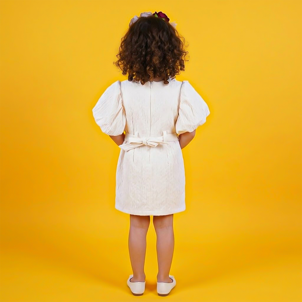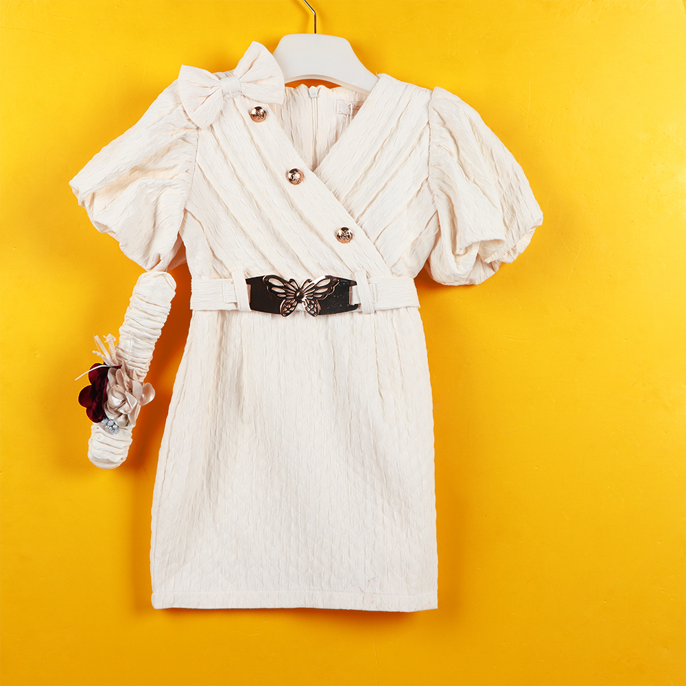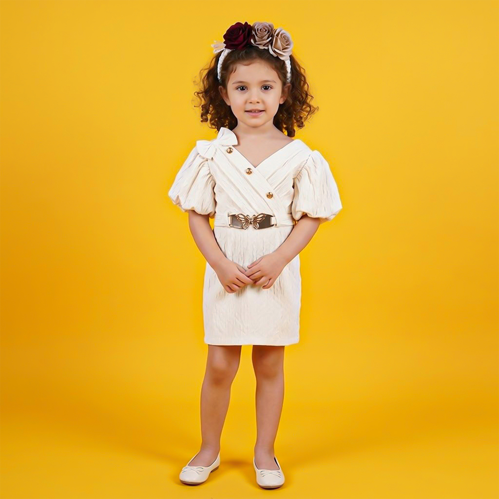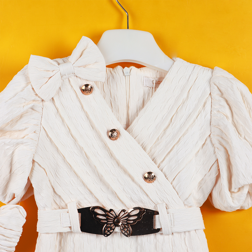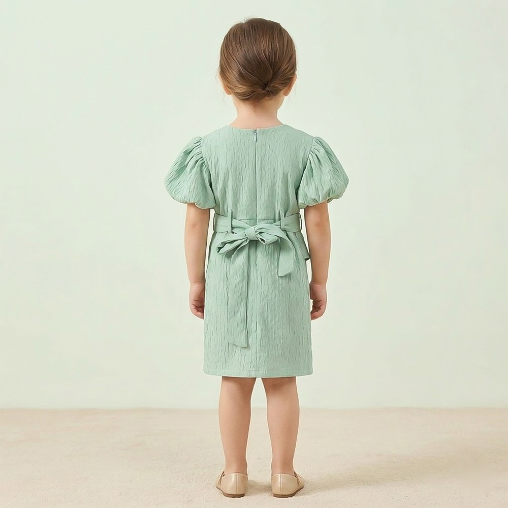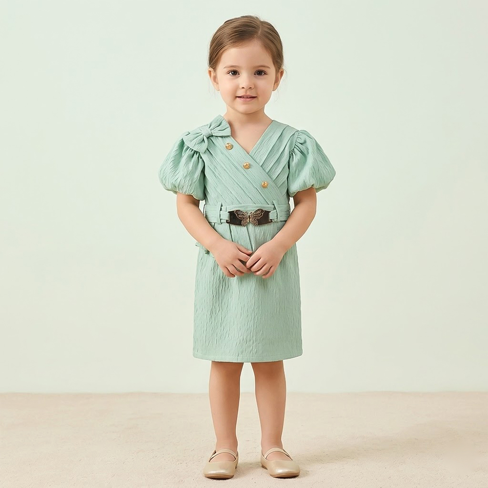 فستان بناتي بأكمام منفوخة و كسرات ممتدة من الأكتاف الى الصدر ، قصة صدر على شكل (V) ، و بحزام على الخصر .