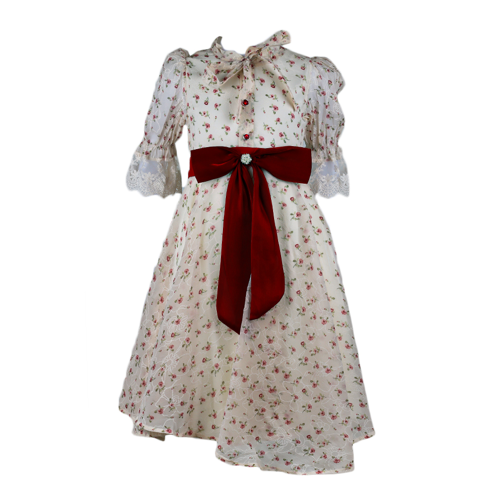 فستان بناتي بأكمام حيران مزينة بالدانتيل بالأطراف ، برقبة مرتفعة عليها ربطة وبأزرار على الصدر ، ويأتي بفيونكة كبيرة على الخصر .