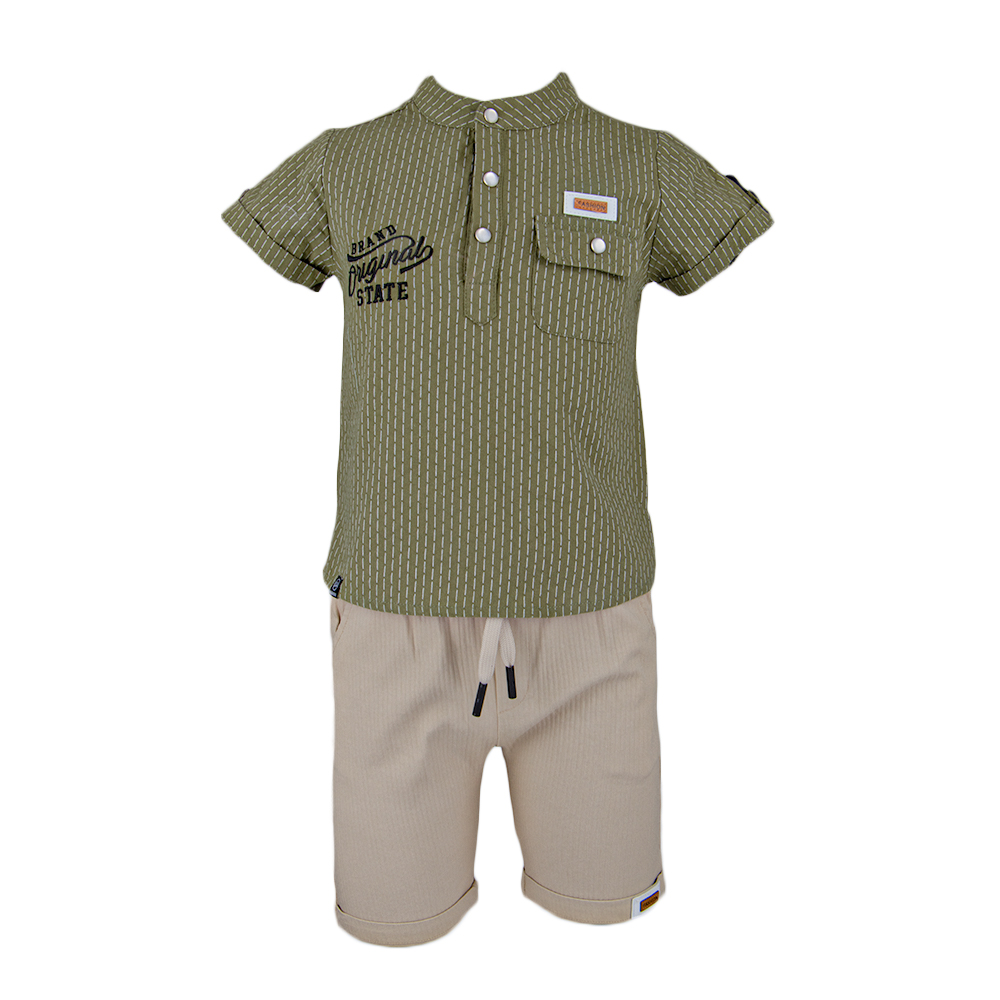 طقم ولادي كاجوال مكون من شميز بأكمام قصيرة ، ازرار على الصدر ، جيب أمامي جانبي ، و بنطلون برمودا بجيوب .