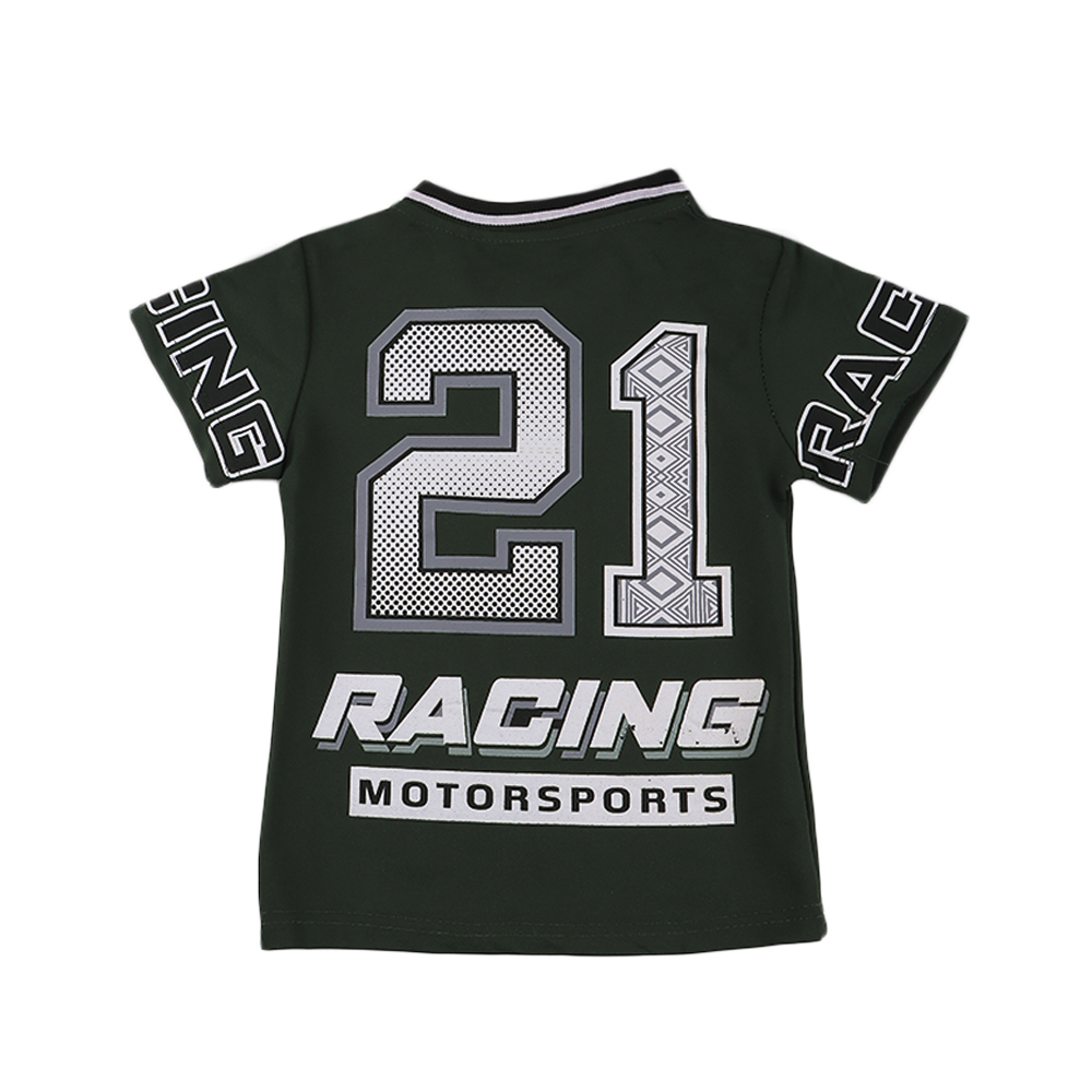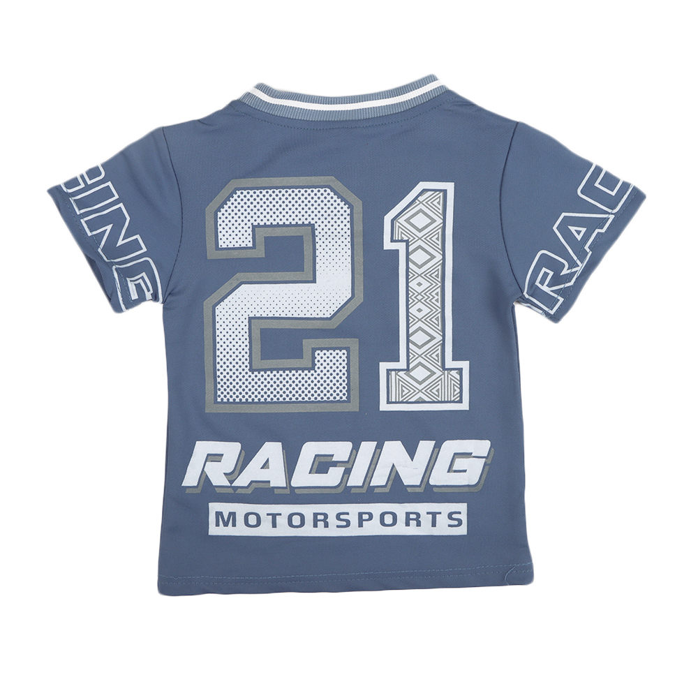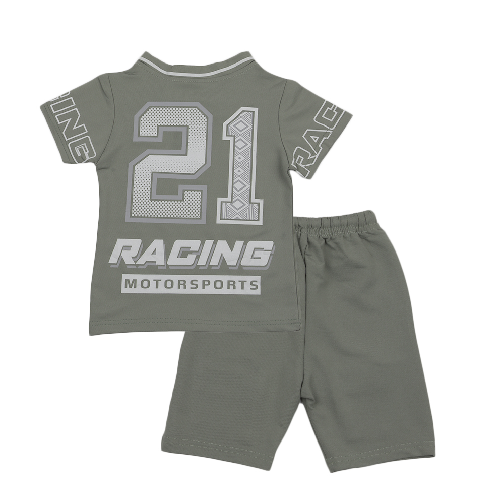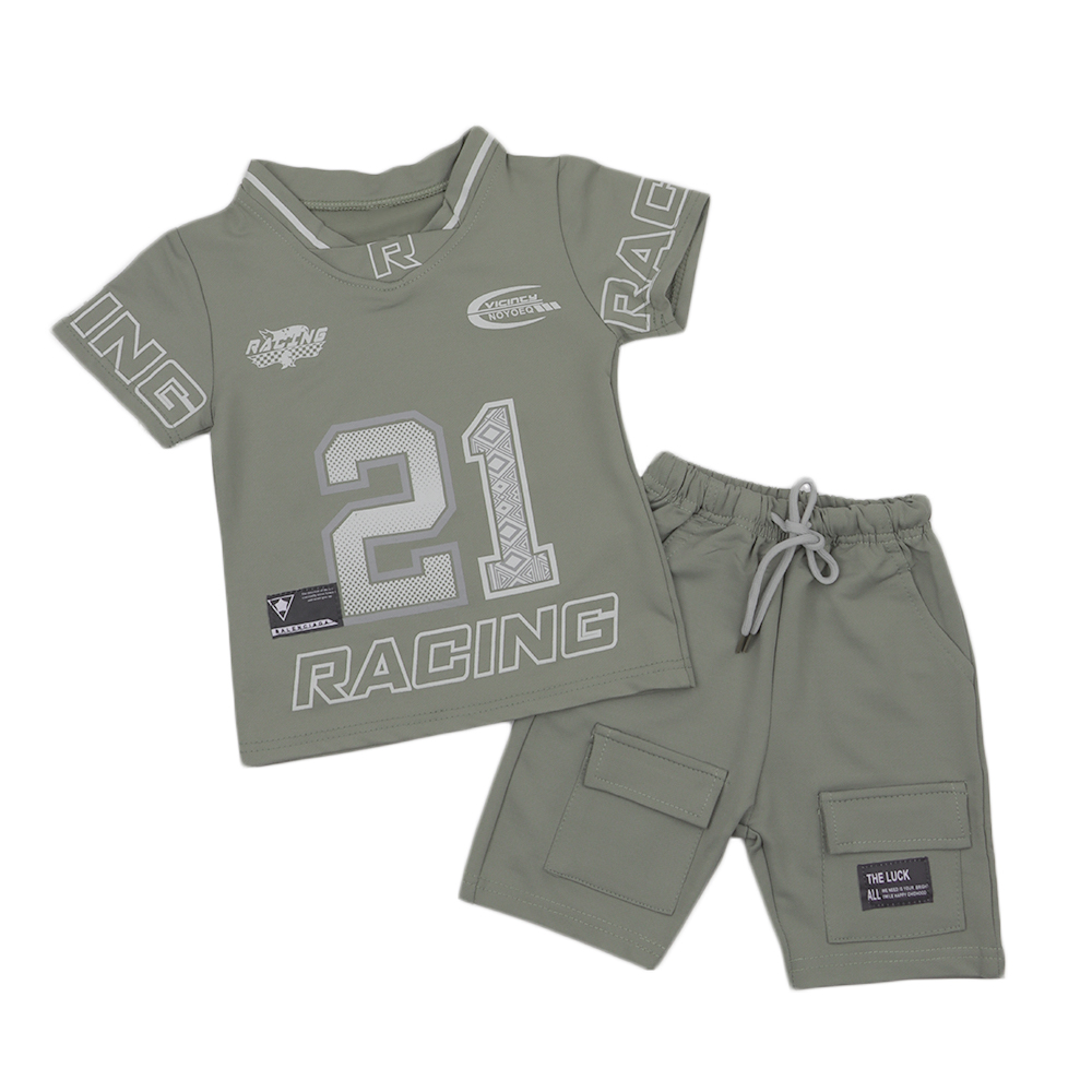 طقم كاجوال ولادي مكون من تيشيرت بياقة على شكل حرف V مزينة بخطين أنيقين مع طبعات سباق عصرية ورقم 21 في الأمام وشورت بجيوب جانبية عملية ورباط خصر لمزيد من الراحة، تصميم مريح وأنيق يناسب الإطلالات اليومية