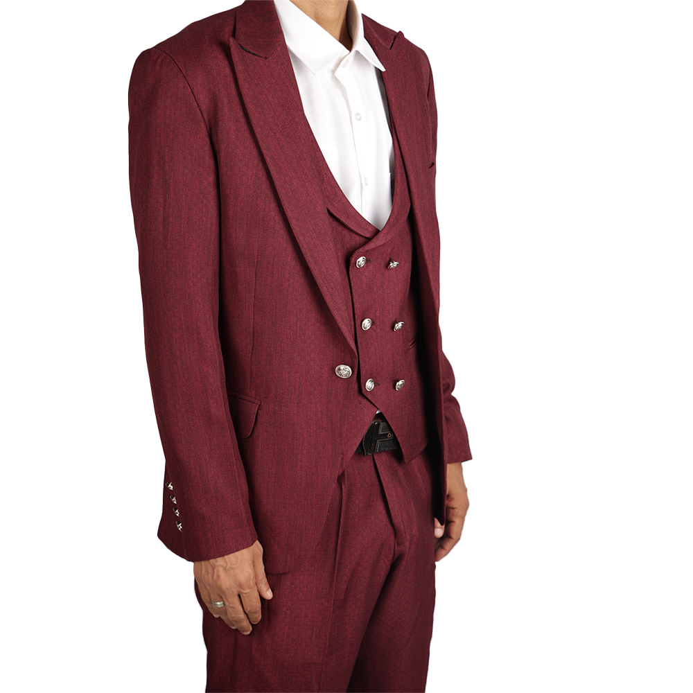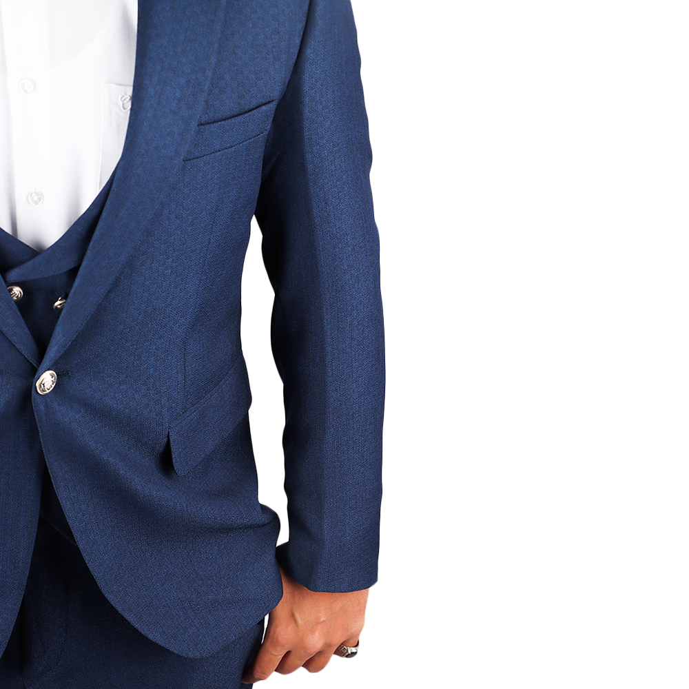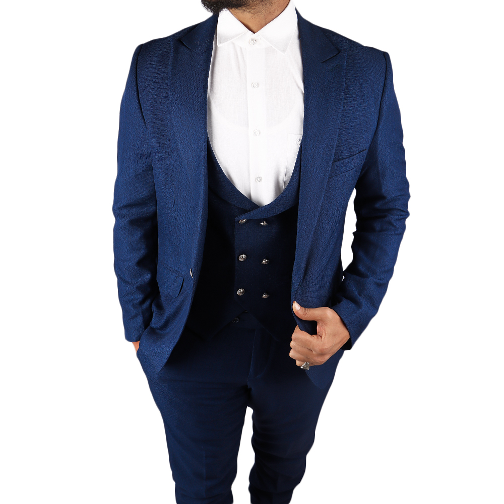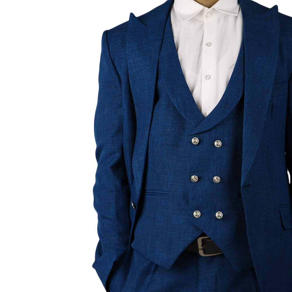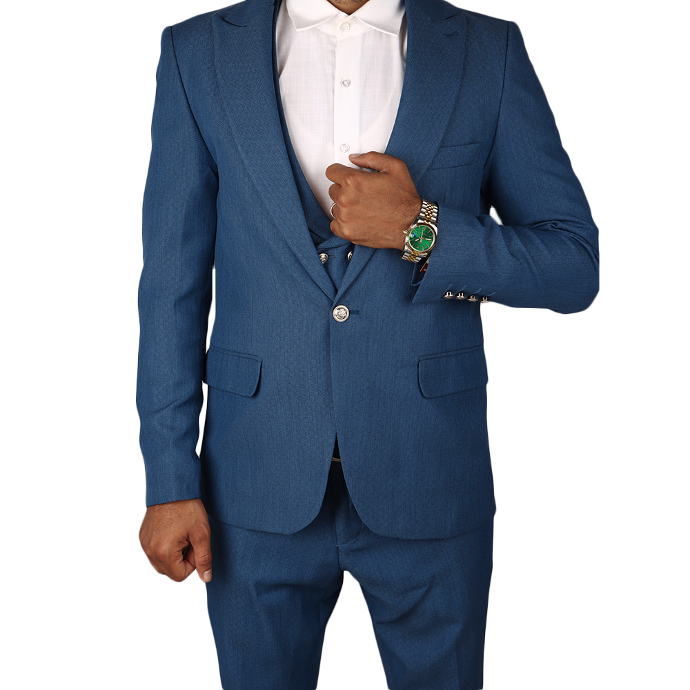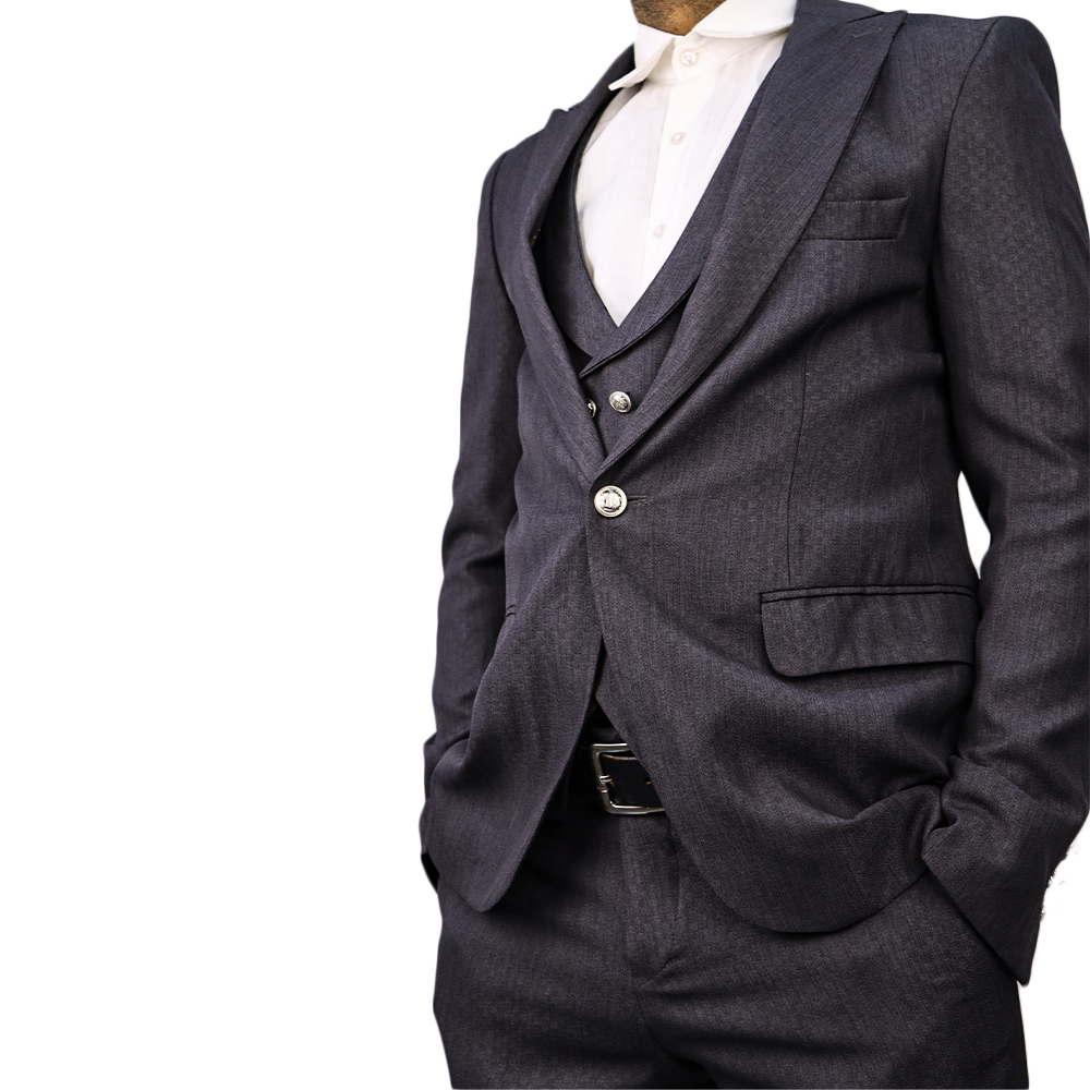 بدلة رجالية فاخرة بتصميم كلاسيكي أنيق مع صديري داخلي مزين بأزرار معدنية مميزة. خيار مثالي لإطلالة راقية في المناسبات الرسمية والحفلات والأعراس.