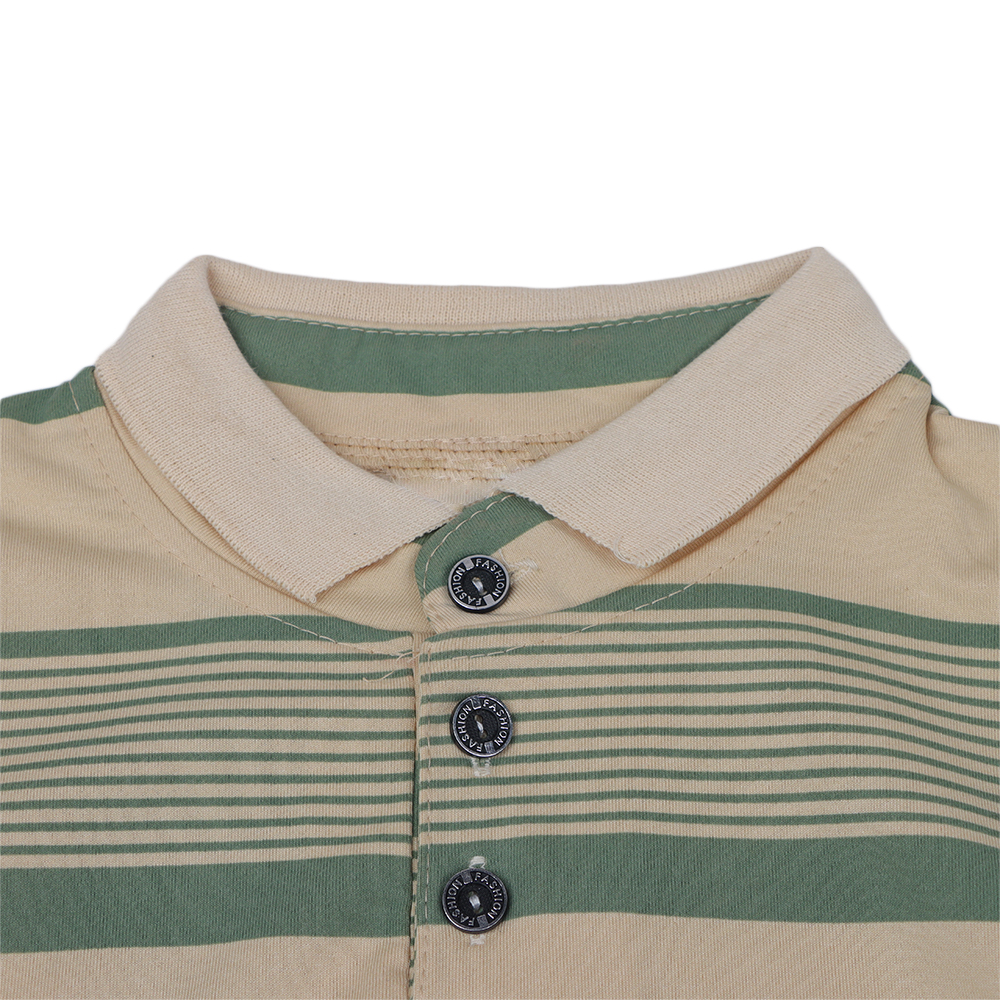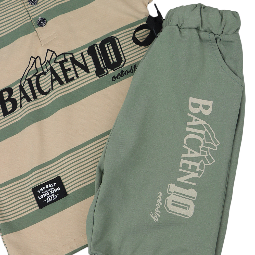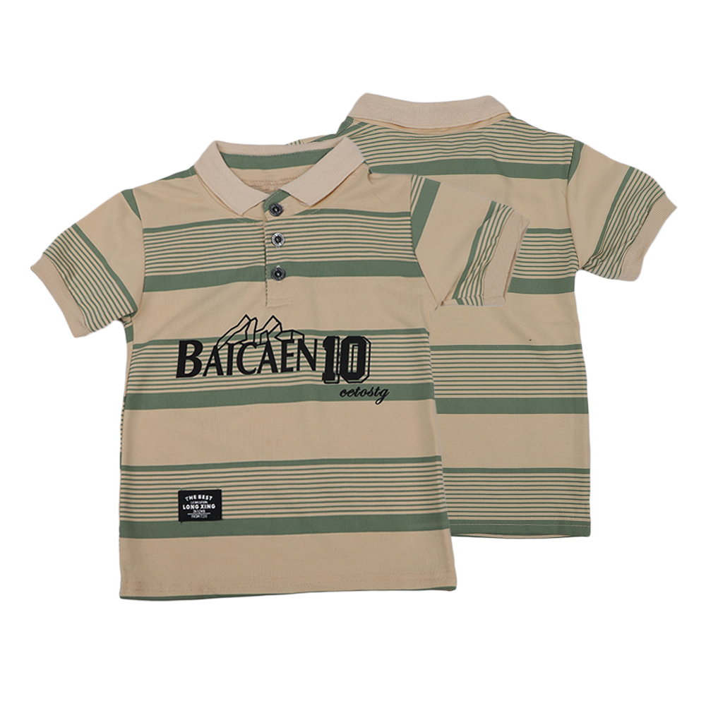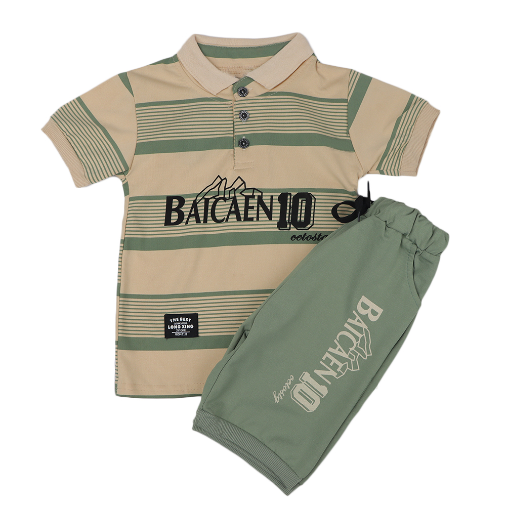 طقم أطفال صيفي مكون من تيشيرت بولو بأكمام قصيرة مخطط مع طبعة أمامية أنيقة مزود بياقة وأزرار يأتي مع شورت بخصر مطاطي مريح وتصميم متناسق مناسب للارتداء اليومي ويجمع بين الراحة والأناقة